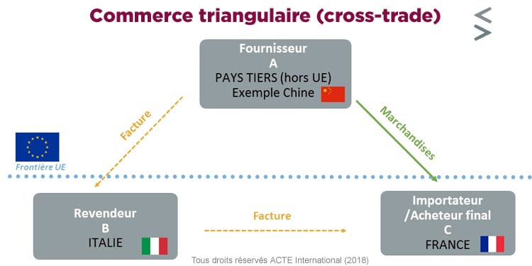 Dans le schéma de commerce triangulaire illustré ci-dessus, nous pouvons donc en déduire que c’est la facture du Fournisseur A (chinois) au Revendeur B (italien) qui doit être utilisée pour le dédouanement en France.